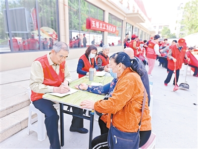 4月20日,在召陵區(qū)煙廠花園,趙國(guó)鎖(左一)為居民測(cè)量血壓、記錄數(shù)據(jù)。