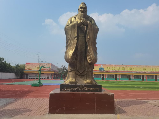 孔子巨大的木雕塑像,以“仁義禮智信”的姿態(tài)歡迎我們。兩側(cè)的敬老愛幼的典故雕像,以及習(xí)近平總書記的金句摘錄、歷代先賢的勵志名言,構(gòu)成了一個別具意味的氛圍。