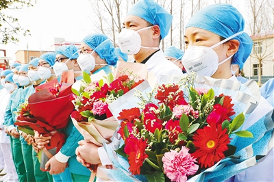 交接儀式上,隔離病區(qū)首批醫(yī)護(hù)人員代表向第二批進(jìn)駐醫(yī)護(hù)人員代表交接隊(duì)旗。市中心醫(yī)院、市傳染病醫(yī)院負(fù)責(zé)人向醫(yī)生、護(hù)士代表獻(xiàn)花。