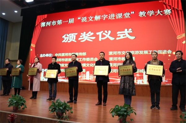 11月29日,由中共漯河市委宣傳部、漯河市文化旅游發(fā)展工作促進(jìn)會(huì),漯河市語言文字工作委員會(huì),漯河市教育局、河南省文字學(xué)會(huì)許慎文化研究會(huì)、漯河市日?qǐng)?bào)社聯(lián)合舉辦的漯河市第一屆“說文解字進(jìn)課堂”教學(xué)大賽總決賽及頒獎(jiǎng)典禮在漯河市郾城中學(xué)舉行。郾城中學(xué)東校區(qū)教師常賽男獲得“說文解字進(jìn)課堂”教學(xué)大賽初中組一等獎(jiǎng),郾城區(qū)實(shí)驗(yàn)小學(xué)曹艷紅獲得“說文解字進(jìn)課堂”教學(xué)大賽小學(xué)組一等獎(jiǎng),郾城區(qū)教育局、郾城中學(xué)均獲得“說文解字進(jìn)課堂”教學(xué)大賽優(yōu)秀組織獎(jiǎng)