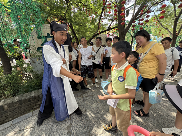 一踏入萬歲山武俠城,古色古香的宋代街巷和建筑便映入孩子們眼簾,仿佛穿越回了千年前的大宋。街道上,鄭記肉鋪、獅子樓、王婆茶莊等實(shí)景店鋪,充滿生活氣息,孩子們好奇地打量著,想象著古人的生活場(chǎng)景。街邊藝人的精彩表演引得孩子們陣陣驚嘆,歡呼聲此起彼伏?!度蜃<仪f》里,逼真的城墻、城門、大炮和烽火臺(tái),激烈的戰(zhàn)斗場(chǎng)面配合影視爆破、云梯炮戰(zhàn)、大型馬術(shù)等實(shí)景拍攝技術(shù),將《水滸傳》中的情節(jié)鮮活呈現(xiàn),孩子們看得目不轉(zhuǎn)睛,被綠林好漢們的江湖豪情深深吸引,演出結(jié)束后,掌聲雷動(dòng)。在萬歲山武俠城內(nèi),孩子們還觀賞了多場(chǎng)精彩絕倫的演出。從《吊環(huán)》的驚險(xiǎn)特技到《大宋奇兵》的英勇無畏,再到《李逵斷案》和《林沖戰(zhàn)楊志》……此外,孩子們還進(jìn)行了一系列互動(dòng)體驗(yàn)活動(dòng)。通過石頭剪刀布、投壺等游戲來賺取銀票,換取自己喜歡的物品。每一場(chǎng)演出都讓孩子們陶醉其中,流連忘返。