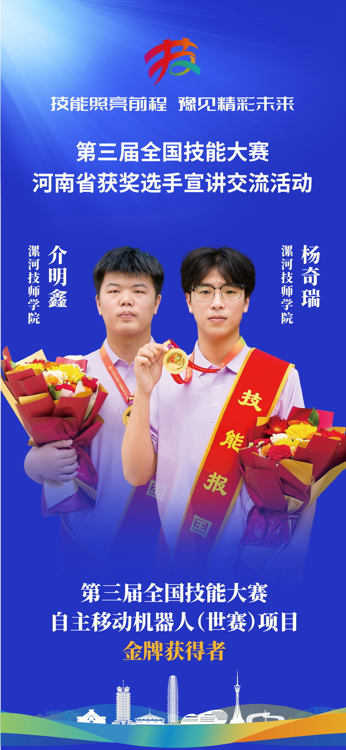 2025年9月,第三屆全國技能大賽閉幕式的聚光燈下,“自主移動機器人(世賽選拔項目)”金牌得主的名字響起——介明鑫與楊奇瑞。兩人揮手快步上前,戴上獎牌的那一刻,有太多未說盡的故事:這不是一枚屬于個人的獎牌,是兩個00后技能青年用一千多個日夜的汗水、上千次的技術攻堅,以及彼此交付后背的信任,共同熔鑄的青春勛章。