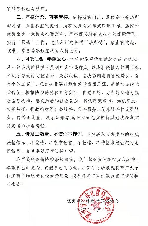 一、高度重視,科學防控。個體工商戶、私營企業(yè)點多、線長、量大、面廣、人員集聚性強,是疫情防控的重要領域和重點環(huán)節(jié)。廣大個體工商戶、私營企業(yè)務必充分認識自身特點,加強政策學習,了解科學知識,掌握防范措施,規(guī)范自身行為,全面準確地貫徹落實漯河市委、市政府的決策部署,堅定信心、眾志成城,積極投身到疫情防控斗爭中去,自覺為全市防控工作做貢獻。