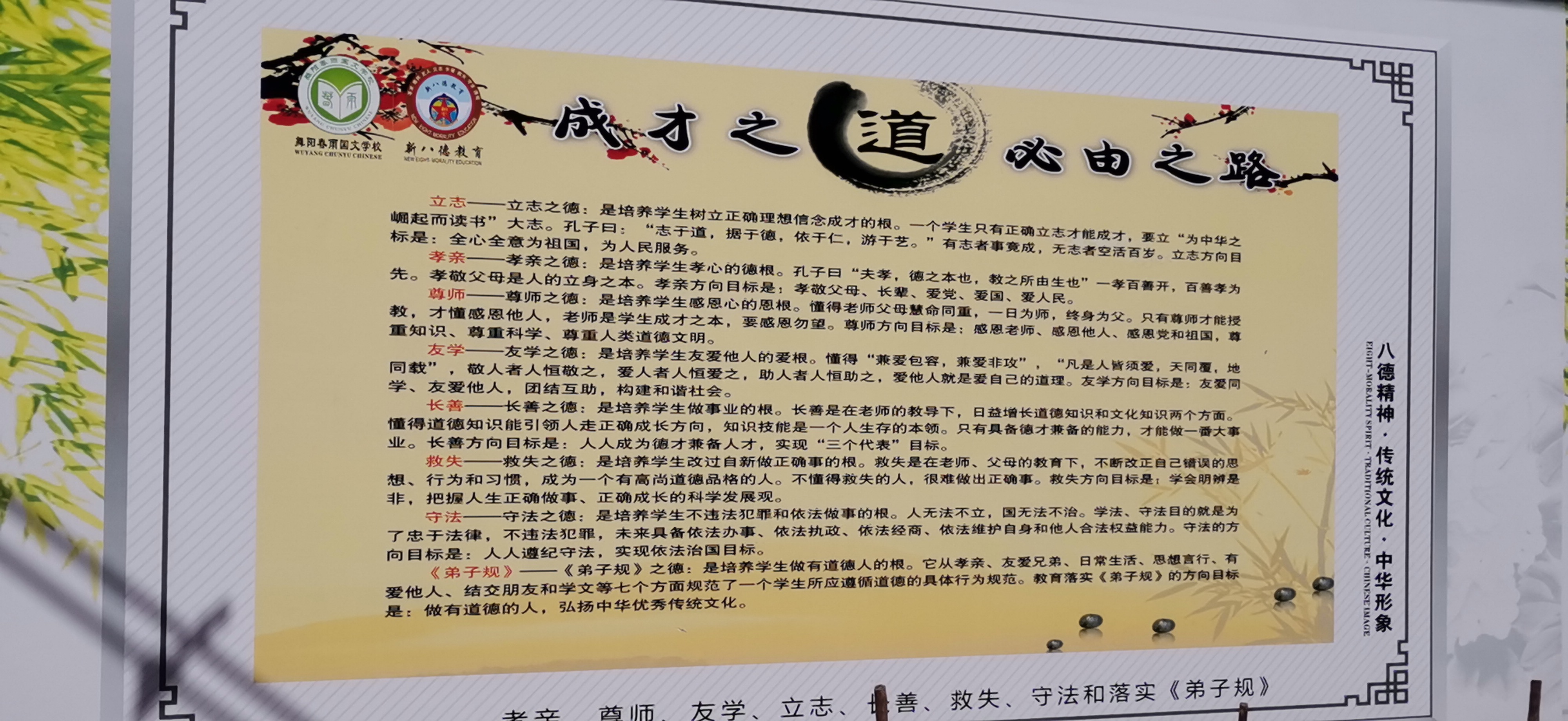 “孝親、尊師、友學(xué)、立志、長(zhǎng)善、救失、守法和落實(shí)弟子規(guī)八個(gè)方面,是培養(yǎng)學(xué)生做人博愛、做事智慧、言行規(guī)范及拓寬心量的高效的立德樹人的教育!”朱喜洋校長(zhǎng)對(duì)于新八德教育用于春雨國(guó)文學(xué)校,滿是自豪和驕傲。