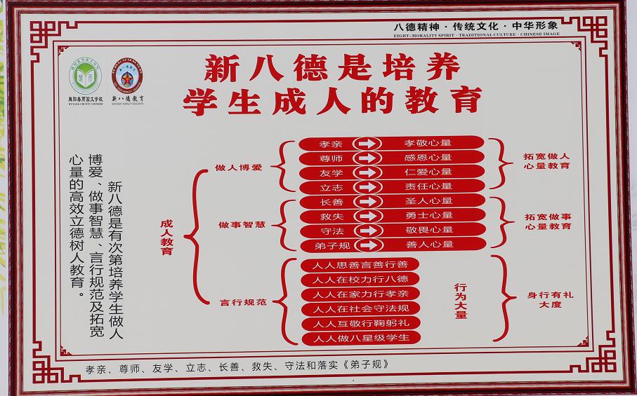 德育是學(xué)校教育的靈魂,是學(xué)生健康成長(zhǎng)和學(xué)校工作的保障,德育的質(zhì)量是學(xué)校辦學(xué)水平的重要標(biāo)志之一,把德育擺到優(yōu)先發(fā)展的位置,能讓學(xué)生受益一生,得益一世!為此,朱喜洋把“新八德”作為德育教育之基之核,他認(rèn)為,抓住了“新八德”,就牽住了德育教育的牛鼻子。
