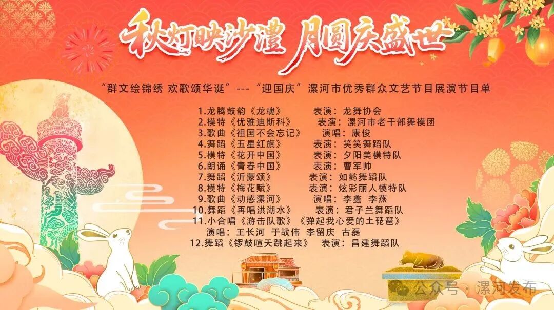 今天19:30,沙澧河風景區(qū)紅楓廣場,“群文繪錦繡 歡歌頌華誕”——漯河市迎國慶優(yōu)秀群眾文藝節(jié)目展演,精彩繼續(xù)!