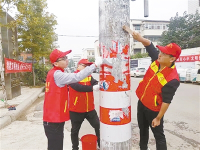 10月16日,臨潁縣人民法院組織志愿者走進(jìn)轄區(qū)銀河家園小區(qū)開(kāi)展志愿服務(wù)。圖為志愿者在清理電線桿上的小廣告。王 波 攝