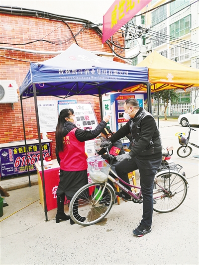 志愿者為社區(qū)居民測量體溫