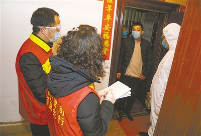 社居委工作人員登門(mén)為居家隔離者進(jìn)行身體檢測(cè)