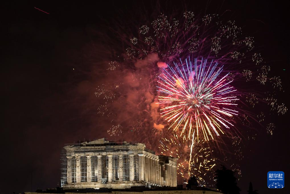 2024年1月1日凌晨,在希臘雅典舉行的迎接新年慶?;顒又?,焰火照亮雅典衛(wèi)城。