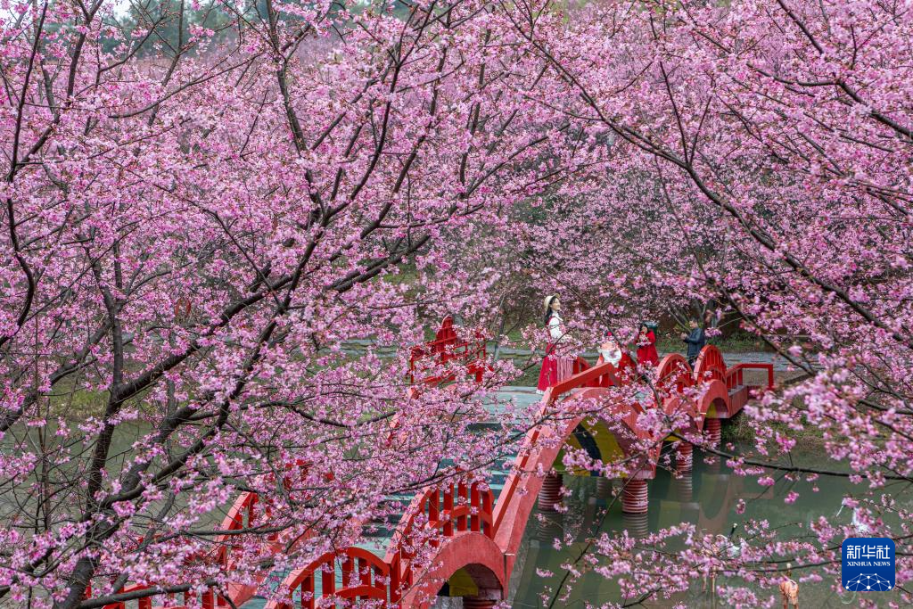 3月2日,游人在湖南省衡陽市常寧市百萬櫻花園景區(qū)游玩。