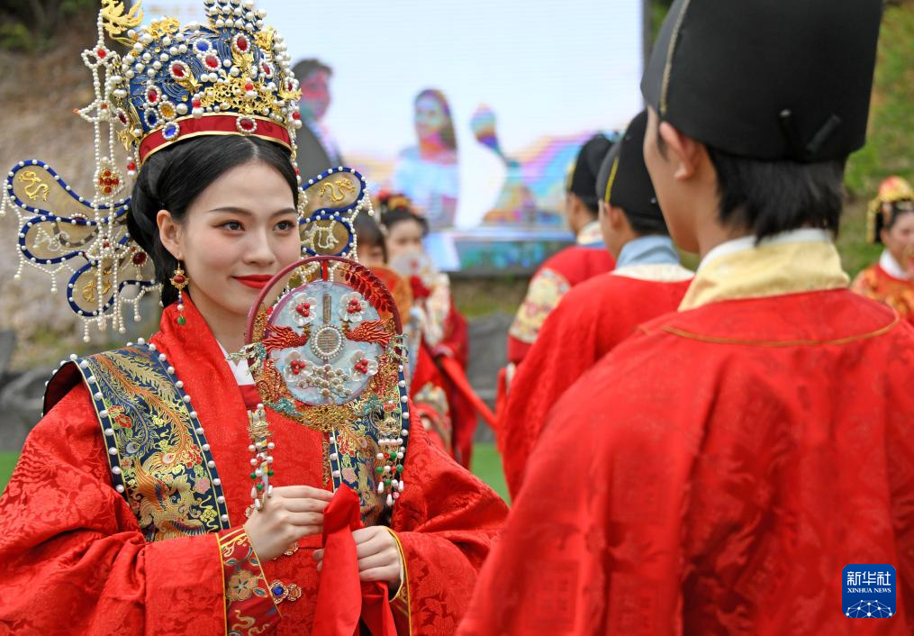 5月20日,在浙江省臺州市仙居縣神仙居景區(qū)南天頂,新人參加宋韻集體婚禮。