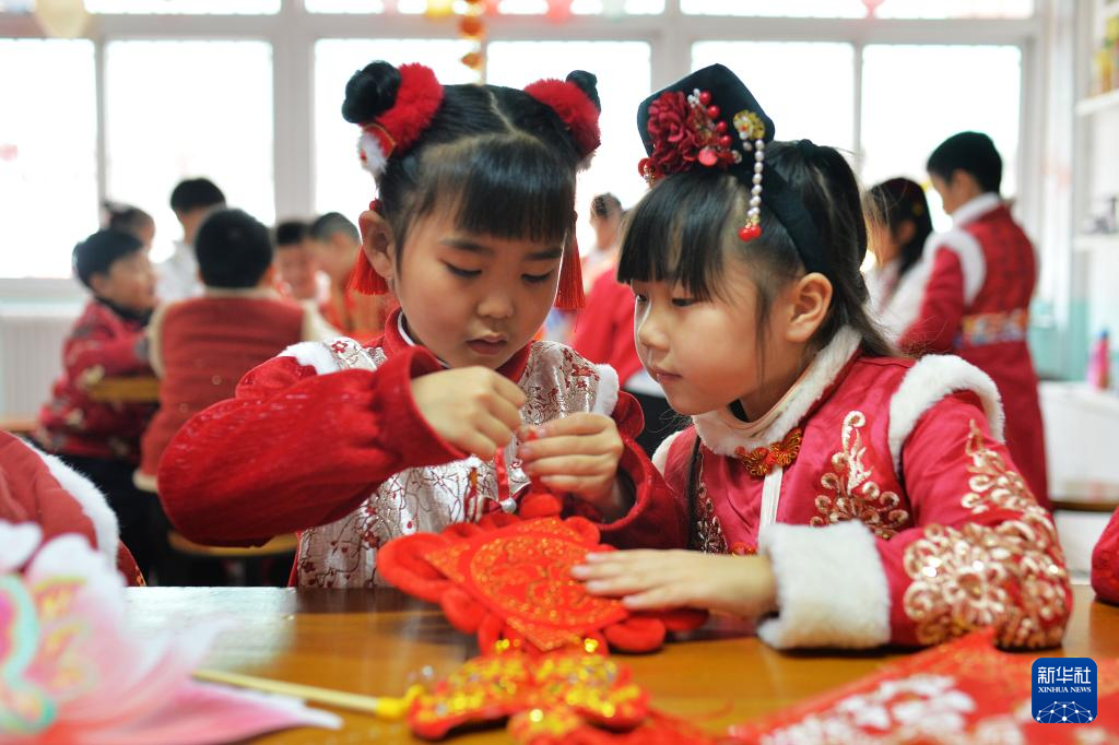 1月14日,在山東青島北仲路第二小學開展的“國風古韻”迎新春主題活動上,兩名學生在給中國結固定線繩。