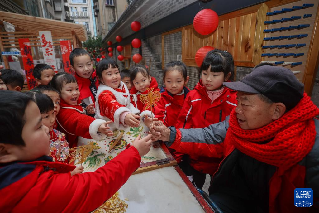 1月13日,在四川省遂寧市船山區(qū)順城街幼兒園舉辦的新春廟會上,孩子們圍觀糖畫制作。