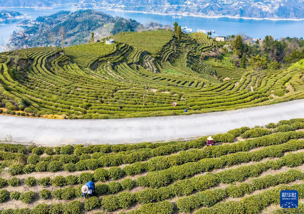 3月18日,湖北省宜昌市秭歸縣茅坪鎮(zhèn)松樹坳村村民在茶園采摘新茶(無人機照片)。