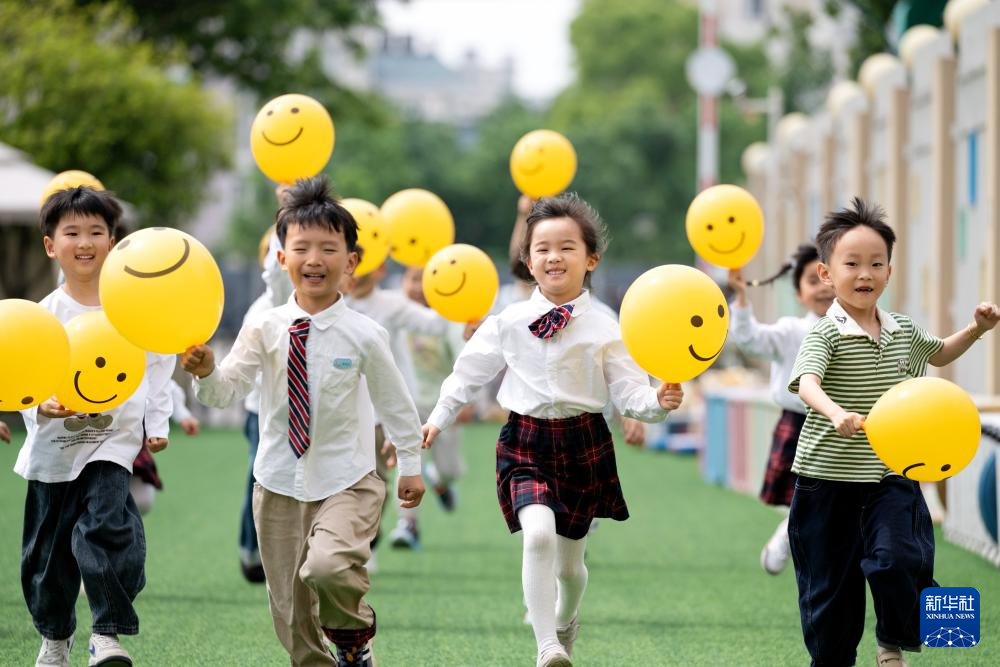 5月6日,浙江省湖州市長興縣實驗幼兒園的孩子們手舉笑臉氣球,進(jìn)行“笑臉賽跑”小游戲。