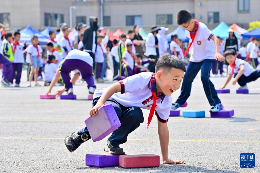 5月30日,在遼寧省鞍山市岫巖滿族自治縣實(shí)驗(yàn)小學(xué),學(xué)生在趣味運(yùn)動(dòng)會(huì)上進(jìn)行“移石過河”游戲。