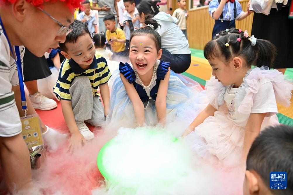 5月30日,山西省太原市迎澤區(qū)師苑幼兒園的小朋友在慶祝“六一”主題活動(dòng)中觀看干冰實(shí)驗(yàn)。