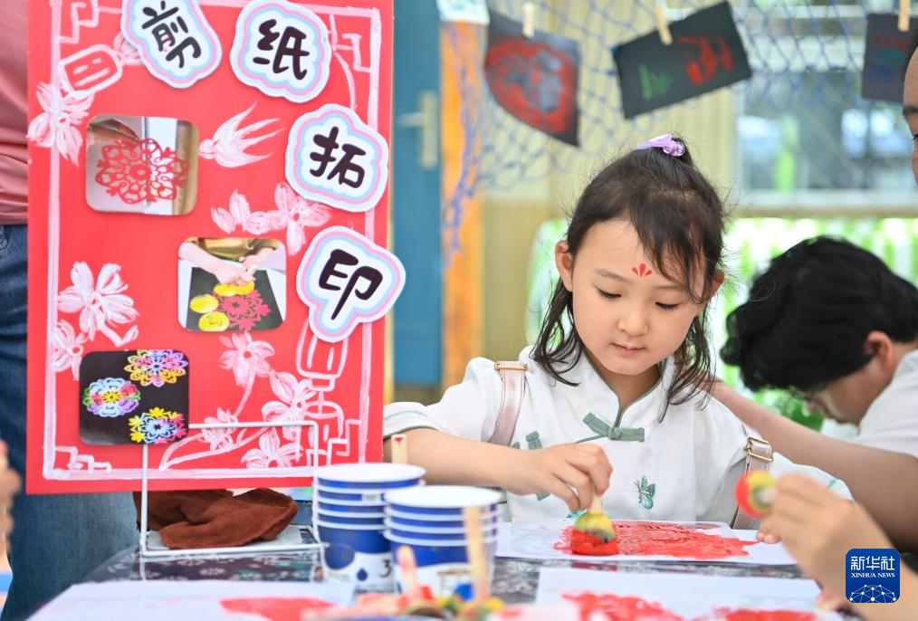 5月30日,山西省太原市迎澤區(qū)師苑幼兒園的小朋友在慶祝“六一”主題活動(dòng)中體驗(yàn)剪紙拓印。