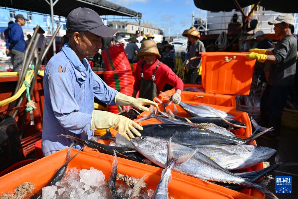 8月21日,在海南省文昌市清瀾漁港碼頭,漁民忙著卸貨。