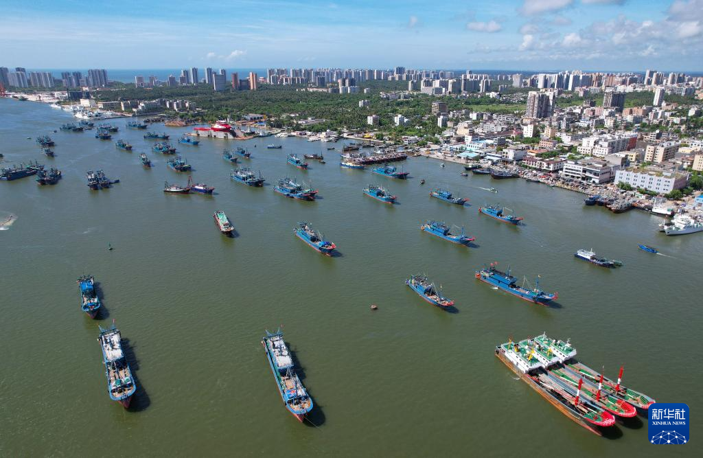 大批漁船在海南省文昌市清瀾漁港碼頭等待卸貨(8月21日攝,無人機照片)。