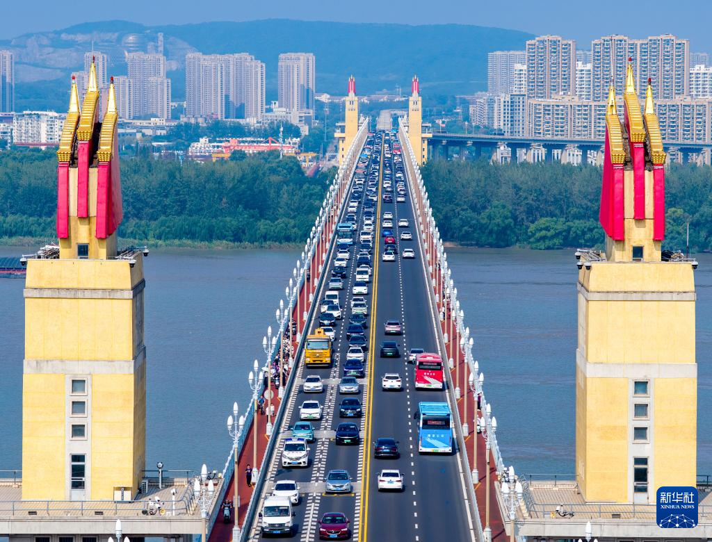 10月8日,車輛行駛在南京長江大橋上(無人機照片)。