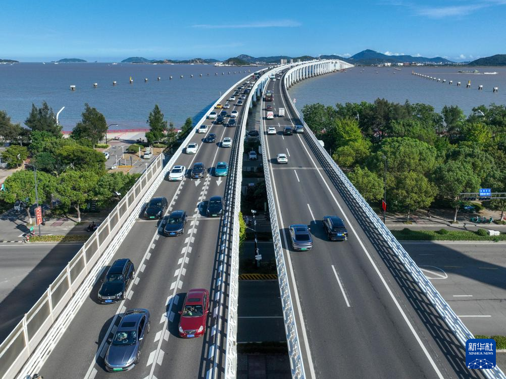 10月7日,在浙江省舟山市普陀區(qū),車輛行駛在朱家尖海峽大橋上(無人機照片)。