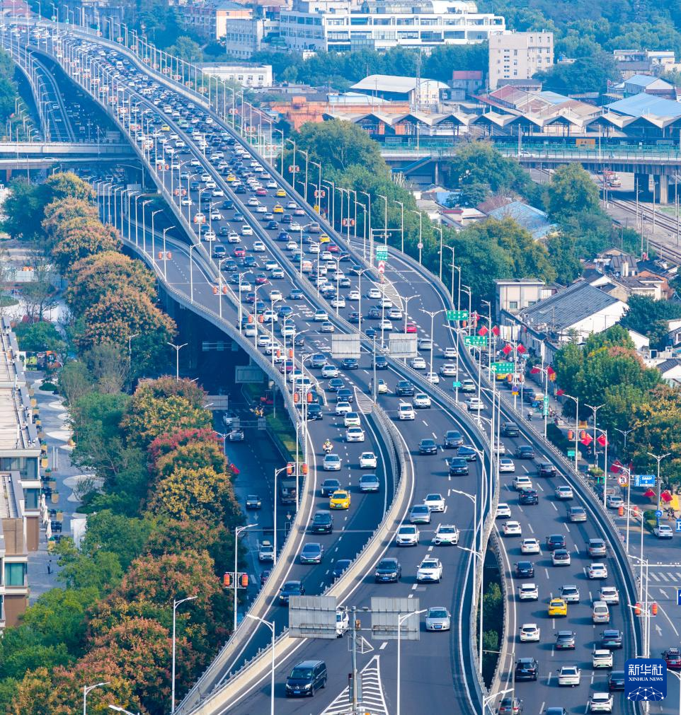10月7日,車輛行駛在江蘇省南京市應(yīng)天高架上(無人機照片)。