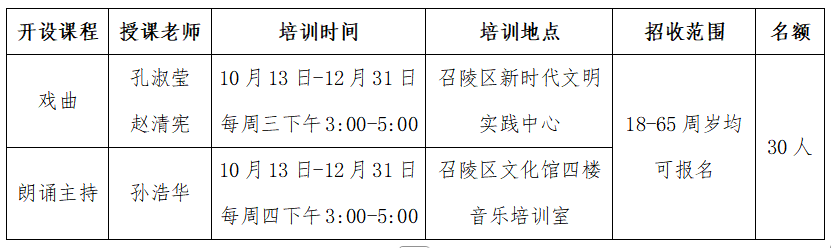 1.報名時間為9月15日至9月19日,有意參加培訓的人員,請攜帶本人有效身份證復印件1張、近期2寸照片1張前往召陵區(qū)文化館辦公室(召陵區(qū)汾河路與祥云路交叉口東南角4樓)報名,電話報名無效,需本人現(xiàn)場報名,代替報名無效,名額有限,報滿截止;報名結(jié)束后,報名人數(shù)不滿70%,則取消該班。培訓時間為10月13日至12月31日。